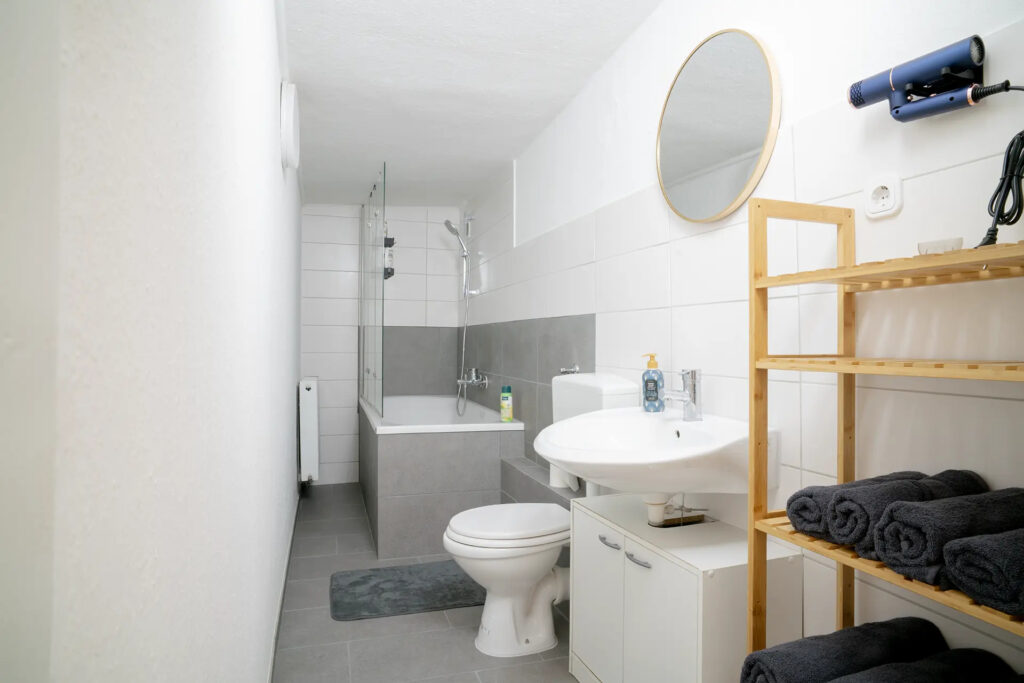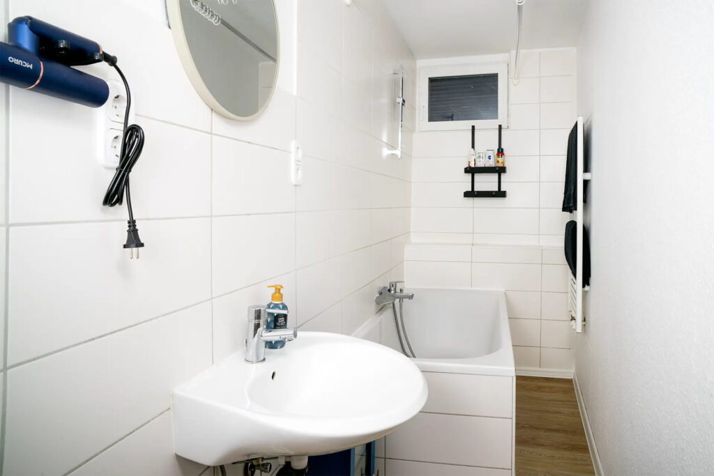 Eigenes Badezimmer mit Badewanne und Haartrockner